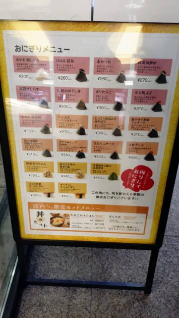 メニューはこんな感じで、テイクアウトで様々なおにぎりを販売、イートインでおにぎりセットとしてお味噌汁・お漬物がついてきた莉、丼ものが販売されていたりしました!