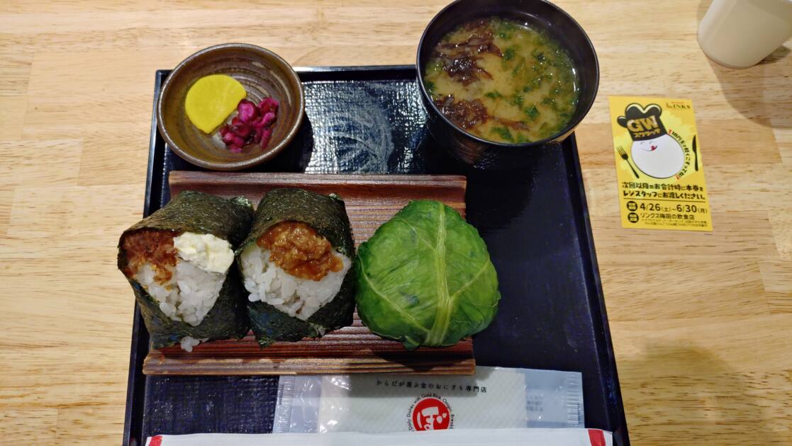 今回私は、「高菜まき」「やきにく」「おかかクリームチーズ」という種類を購入し、セットとして、お漬物、あおさのお味噌汁がついたCセットを注文いたしました(*´˘`*)