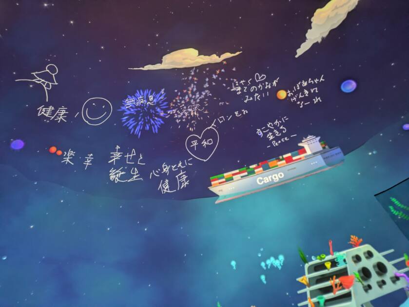 先ほどのエリアで書いたことが上階の天井に送られ、写真のように表示されるというギミックでした✨