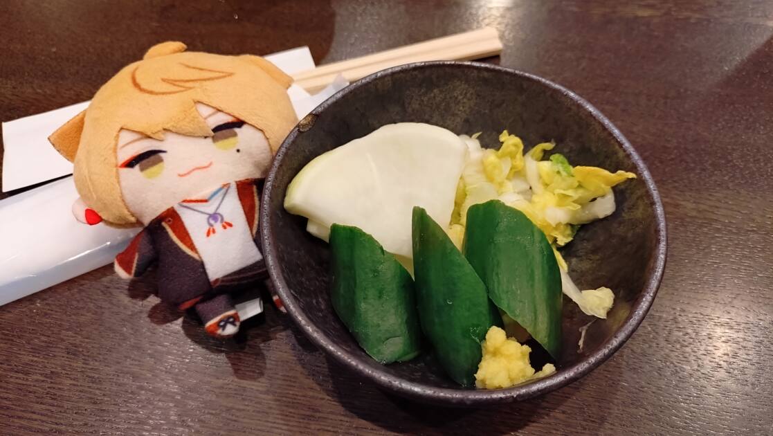 左の写真は基本的についてくるお漬物で、大根・きゅうり・白菜の3種類でした!これらの味は、けっこうあっさりでシャキシャキしており、食感を楽しめました(*´∀`*)