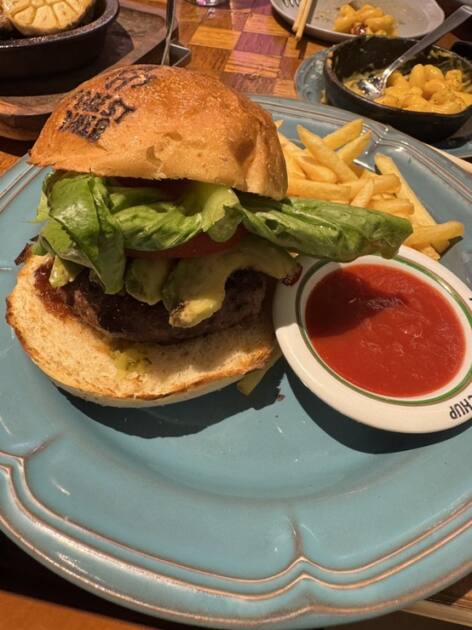 こちらは『牛タンバーガー』です!あまりのボリュームにびっくりするので、もし食べたい場合は早めに注文するのがおすすめです。バーガーのほかにセットでついているポテトも量があるので小食な方は注意です!