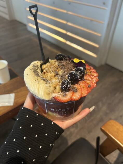 アサイーは、ほんのり甘くてもったりしていてリンゴ・パインが下に入っており上にはイチゴ・バナナ・カカオニブ・ブルーベリー・グラノーラ・ナッツ・ハチミツがトッピングされておりアサイーの甘さにナッツのほろ苦さががとても相性良く美味しかったです(^-^)/