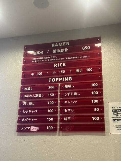 肉増し・ほうれん草増し・のり増し・もやキャベ・ネギチャー・麺増し・うずら増し・キャベツ・もやし・味玉・メンマでした!!