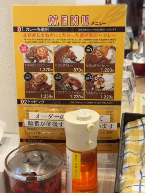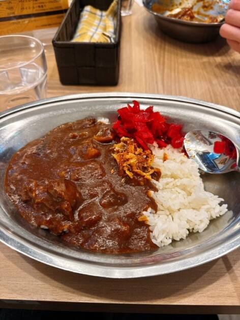 辛さは中辛程度で、少しピリッとするかな?という程度でした。玉ねぎの甘さのほうが強く感じました。卓上にはホットオイルと福神漬けがありました。ホットオイルで辛みを調整できるようです。