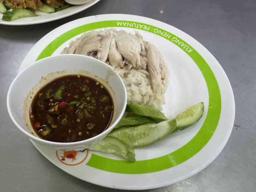 『緑のカオマンガイ』は創業1932年で、本当の店名は『クワンヘン・ガイトーン・プラトゥーナム』といい、バンコクのプラトゥーナムで365日24時間美味しいカオマンガイを作り続けているそうです。スタッフが緑色のポロシャツを着ていることから『緑のカオマンガイ屋』という愛称で呼ばれるようになったのだそうです✨
