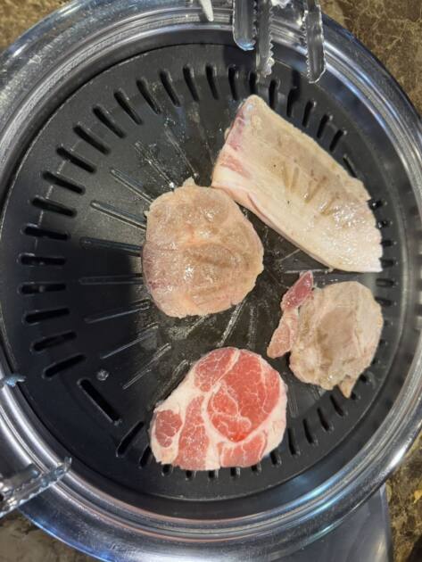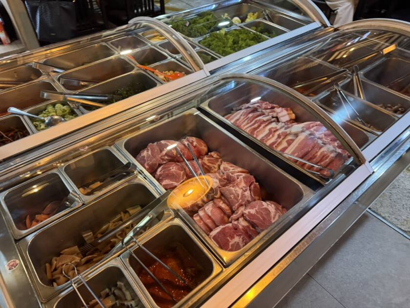 日本ではあまり見ない冷蔵ケースにお肉が入っているので、ここから自分たちで食べる分を取ってテーブルの網で焼いて食べます。
