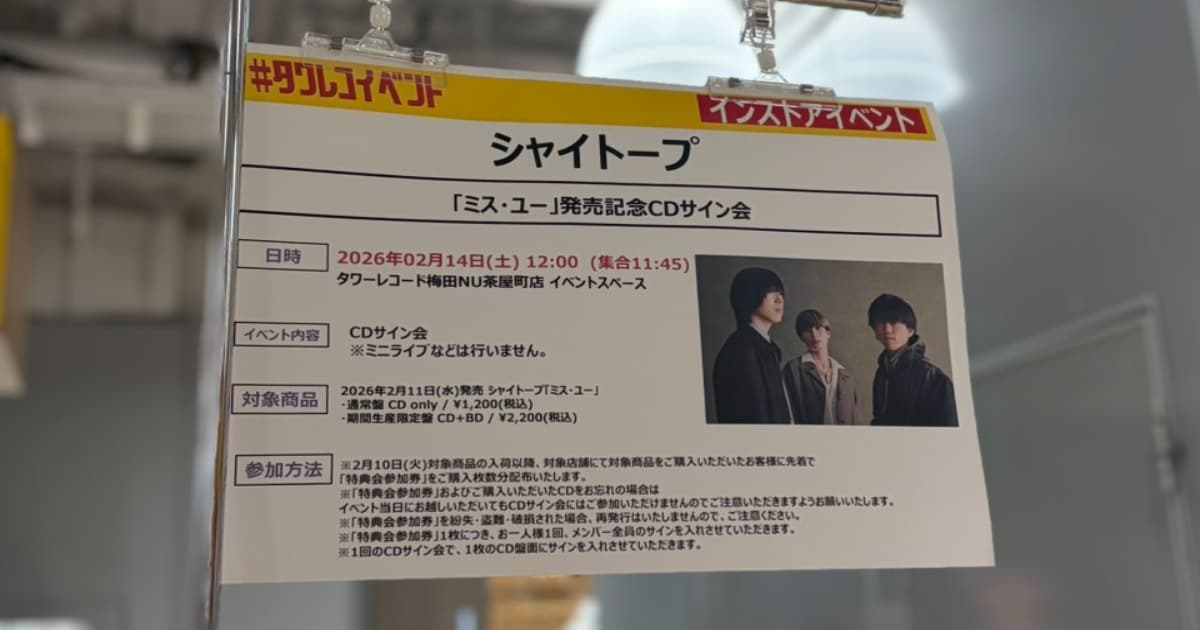 今回は、大阪府大阪市北区茶屋町にあるタワーレコードで【シャイトープサイン会】が行われ参加してきましたので、紹介していきたいと思います(^O^)/