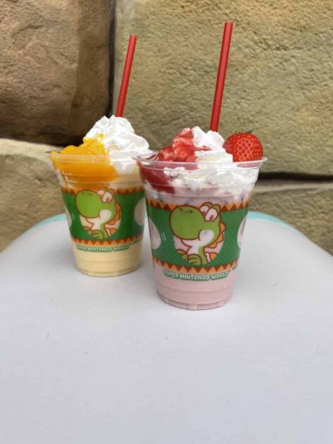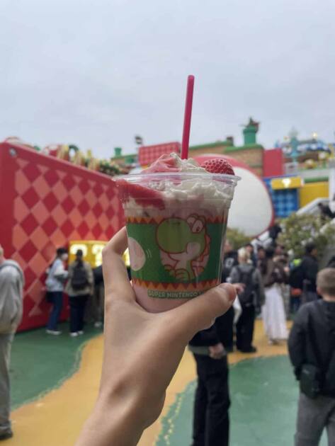 ユニバーサル・スタジオ・ジャパンのニンテンドーワールドを歩いていると、ずっと気になっていたヨッシースナックアイランドが目に入りました。かわいいヨッシーのイラストが並んでいて、つい足が止まる場所です。せっかく来たから何か飲みたいと思い、今回選んだのは“ヨッシーのラッシー(ストロベリー味)”でした。カップにはヨッシーの顔がどーんと描かれていて、それだけで写真を撮りたくなるようなかわいさです。