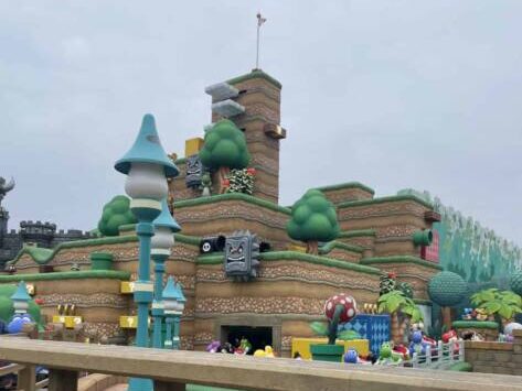 アトラクション内の世界観は、ヨッシーが主人公として活躍した「ヨッシーアイランド」の雰囲気そのまま。カラフルでかわいらしい景色が続き、ゲームの中に入ったような気分になります。屋内だけでなく、途中で屋外のレールに出る場面があり、そのタイミングでニンテンドーワールド全体の景色が見渡せます。ピーチ城やキノピオカフェなど、いつも歩いて見ている景色とは違う角度から眺められるため、ちょっとした特別感があります。