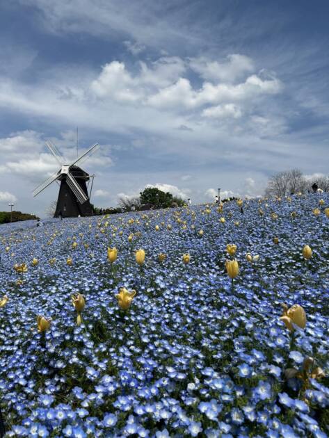 そこを通り抜けるとやっとたどり着きました。そこにはたくさんのネモフィラと黄色のチューリップが綺麗に咲いていて感動しました!