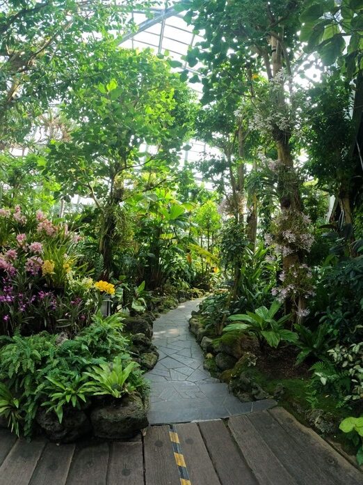 公園の中に「咲くやこの花館」という施設があったので入ってみました。室内にいろいろな植物があります。日本では見られない熱帯植物や高山植物が建物内に広がっています。