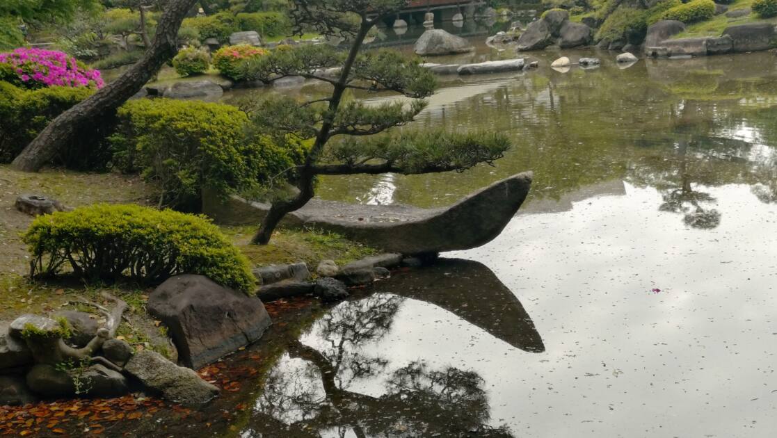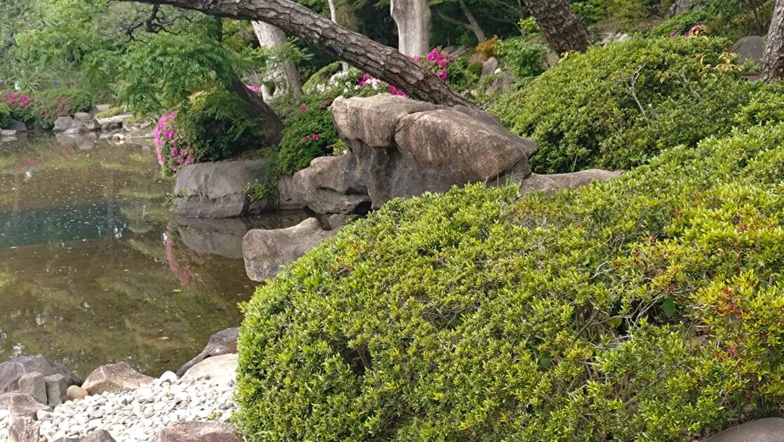 左の石は「龍頭石(りゅうずいし)」という石で、古くから水の神・雨の神として信仰されてきた龍は、日本庭園においても水の恵みや豊穣を願う大切な意味が込められているようです。ここでは、巨大な石で表現された迫力ある龍の「頭」が見ることが出来ました。そして、その胴体はツツジの低木によって巧みに表現されており、まるで龍が水辺を巡っているかのような景観を作り出されていました。